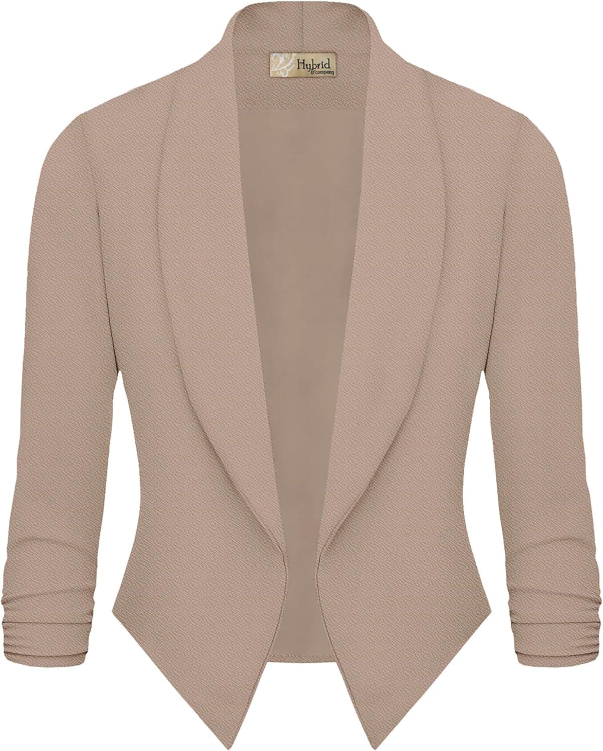 Hybrid & Company Lightweight Open Front Cardigan Classic Ruched Sleeve Work Office Blazer Suit Jackets(Beige)
