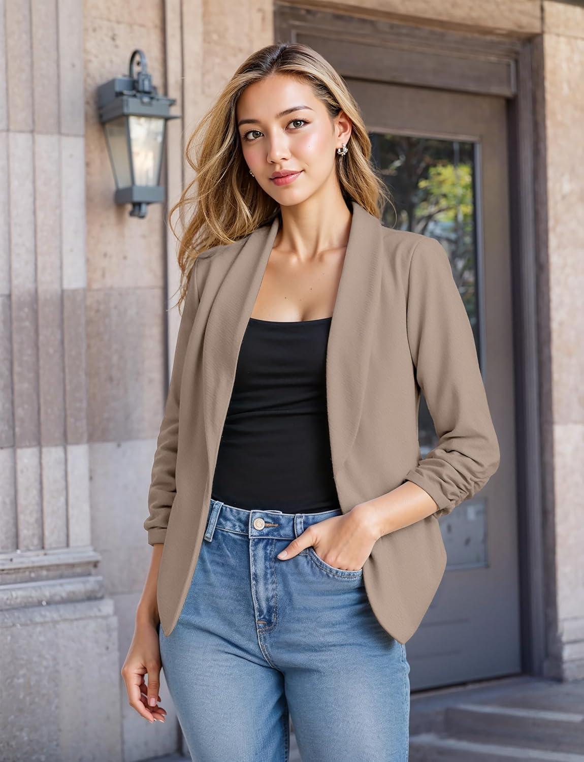 Hybrid & Company Lightweight Open Front Cardigan Classic Ruched Sleeve Work Office Blazer Suit Jackets(Stone)