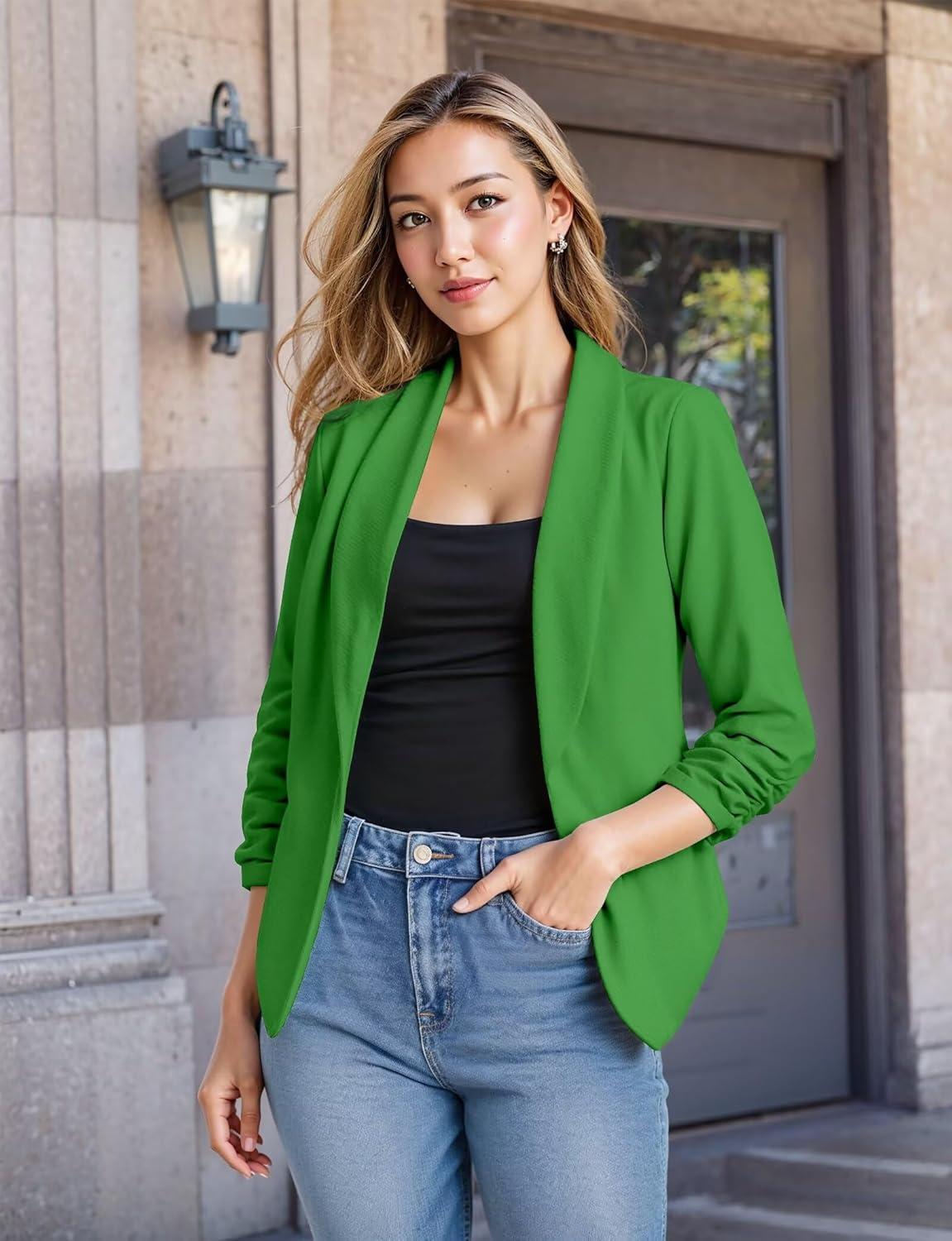 Hybrid & Company Lightweight Open Front Cardigan Classic Ruched Sleeve Work Office Blazer Suit Jackets(Kgreen)