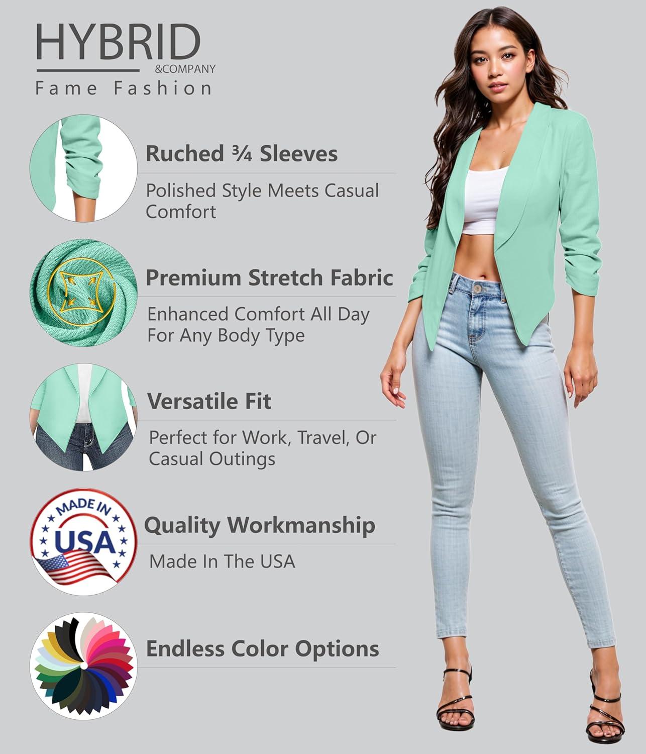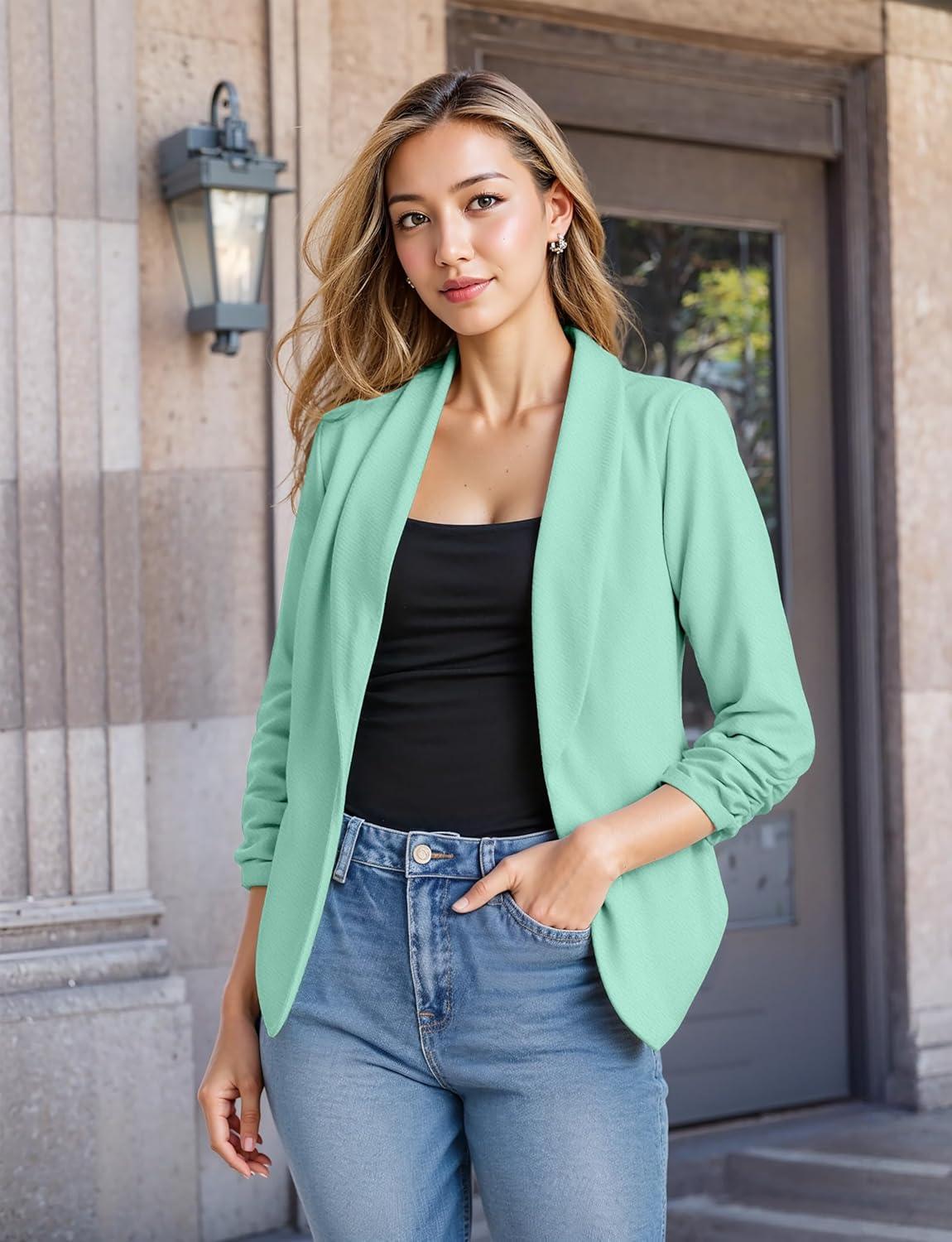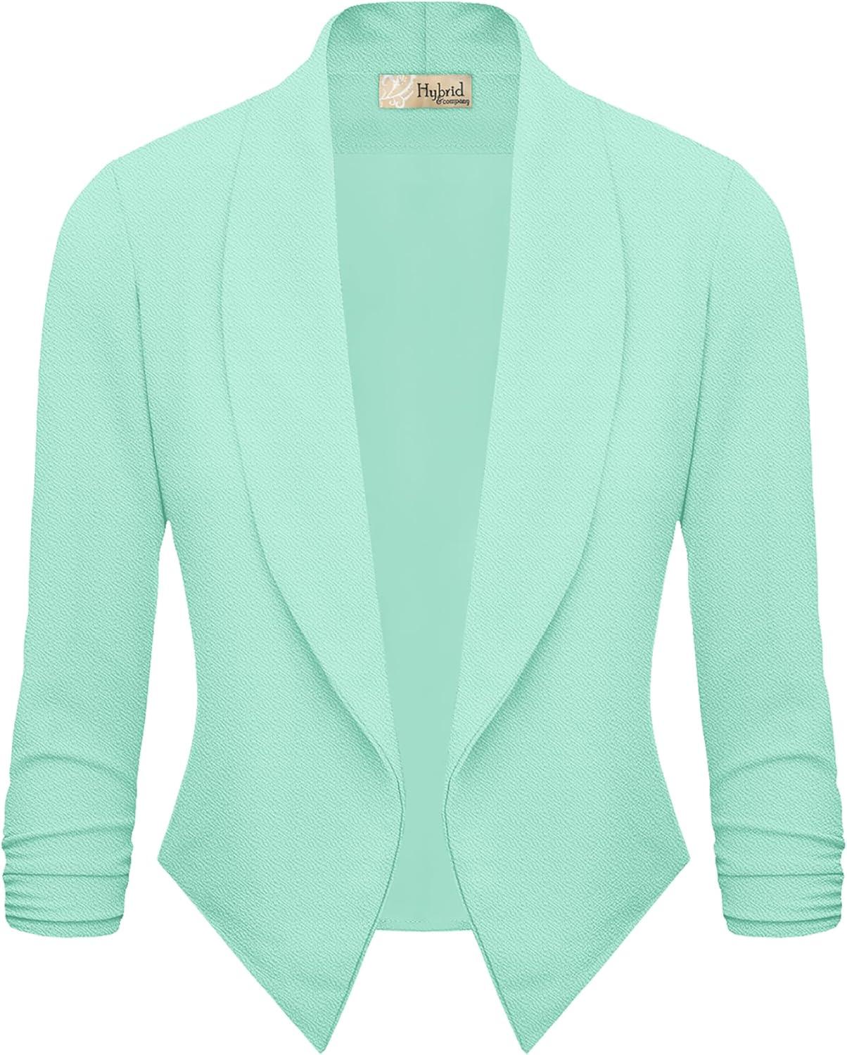 Hybrid & Company Lightweight Open Front Cardigan Classic Ruched Sleeve Work Office Blazer Suit Jackets(Mint)