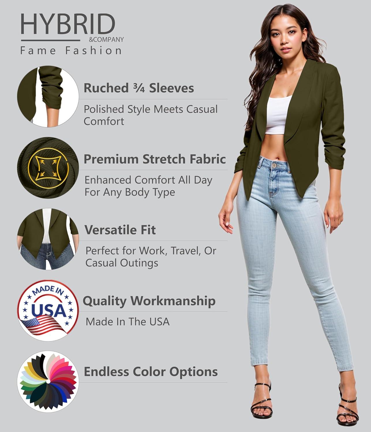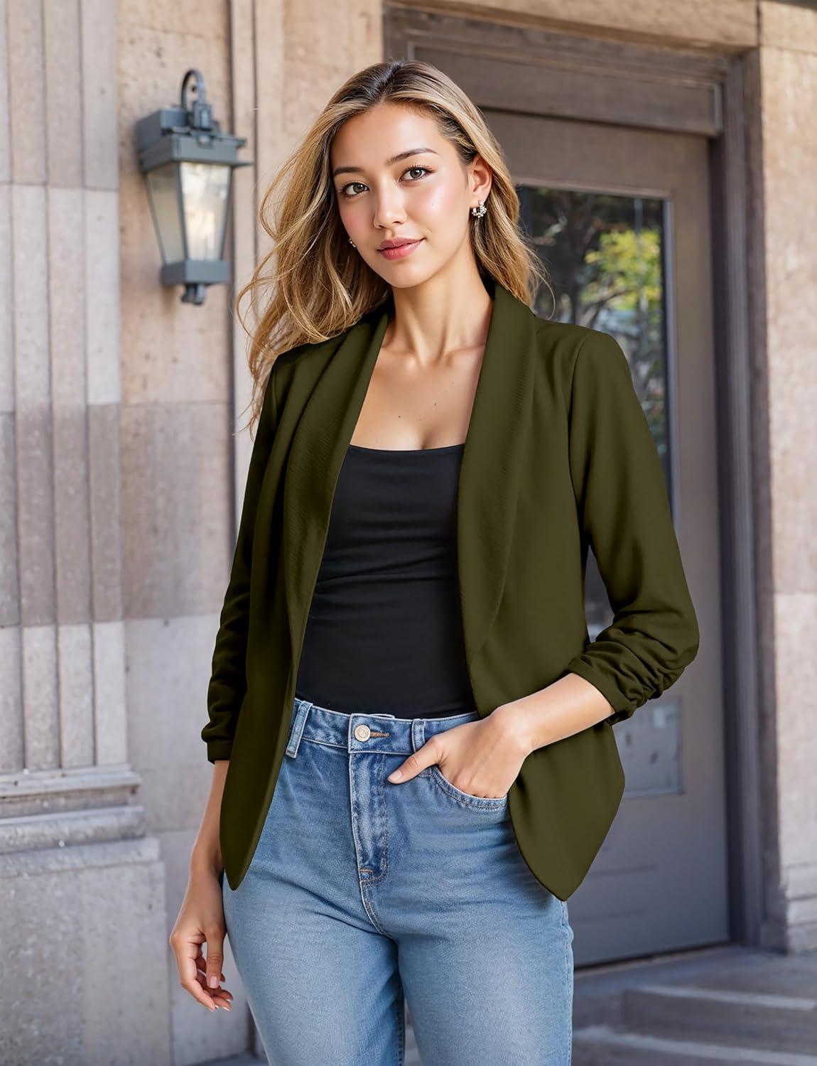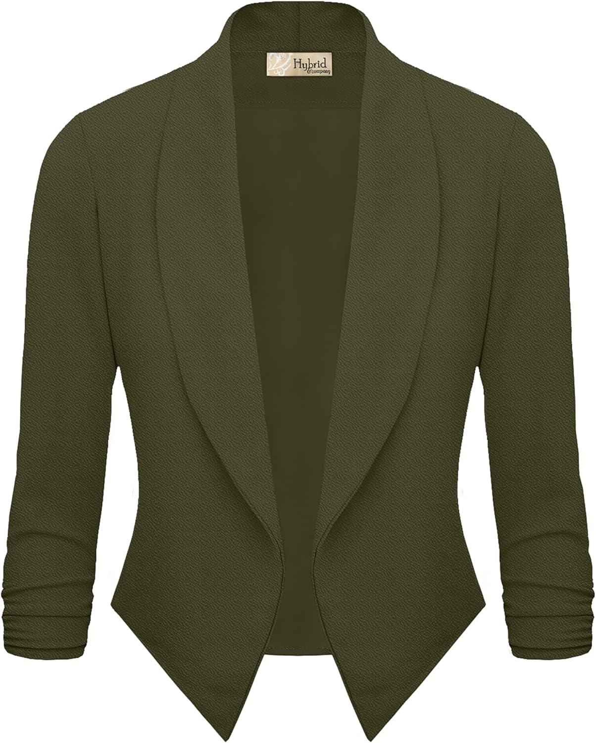 Hybrid & Company Lightweight Open Front Cardigan Classic Ruched Sleeve Work Office Blazer Suit Jackets(Olive)