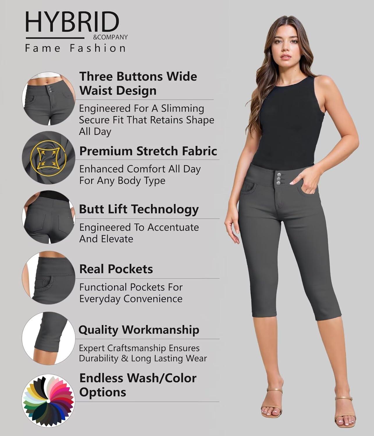 Hybrid & Company Women 3 Button High Waist Pant/Bermuda/Capri/Short is perfect for you! With the perfect amount of stretch, these denim pant are sure to become one of your favorite wardrobe staples. They come in a variety of beautiful colors and inseam length that will match any outfit. These pants are designed to lift and shape your butt while keeping you comfortable all day long. Featuring an elastic waistband with three buttons for adjustable sizing, high-rise fit through the hips, and skinny leg openings that hug every curves.