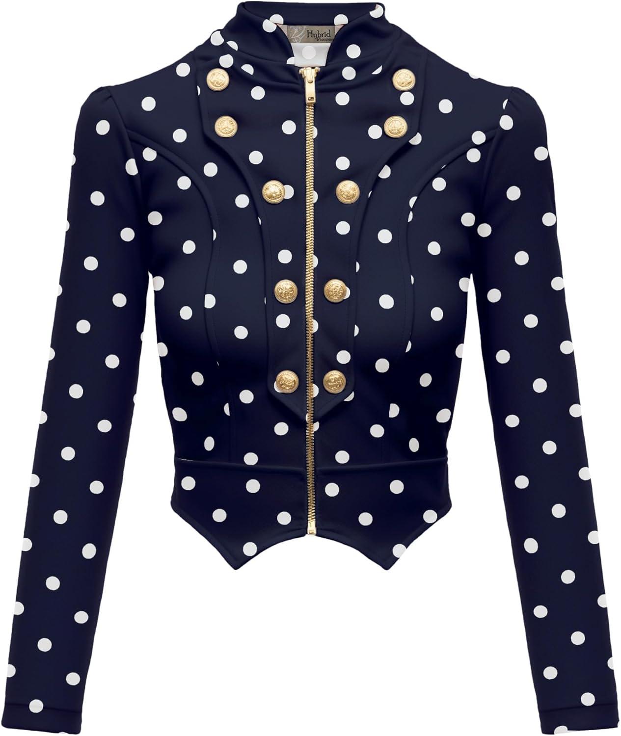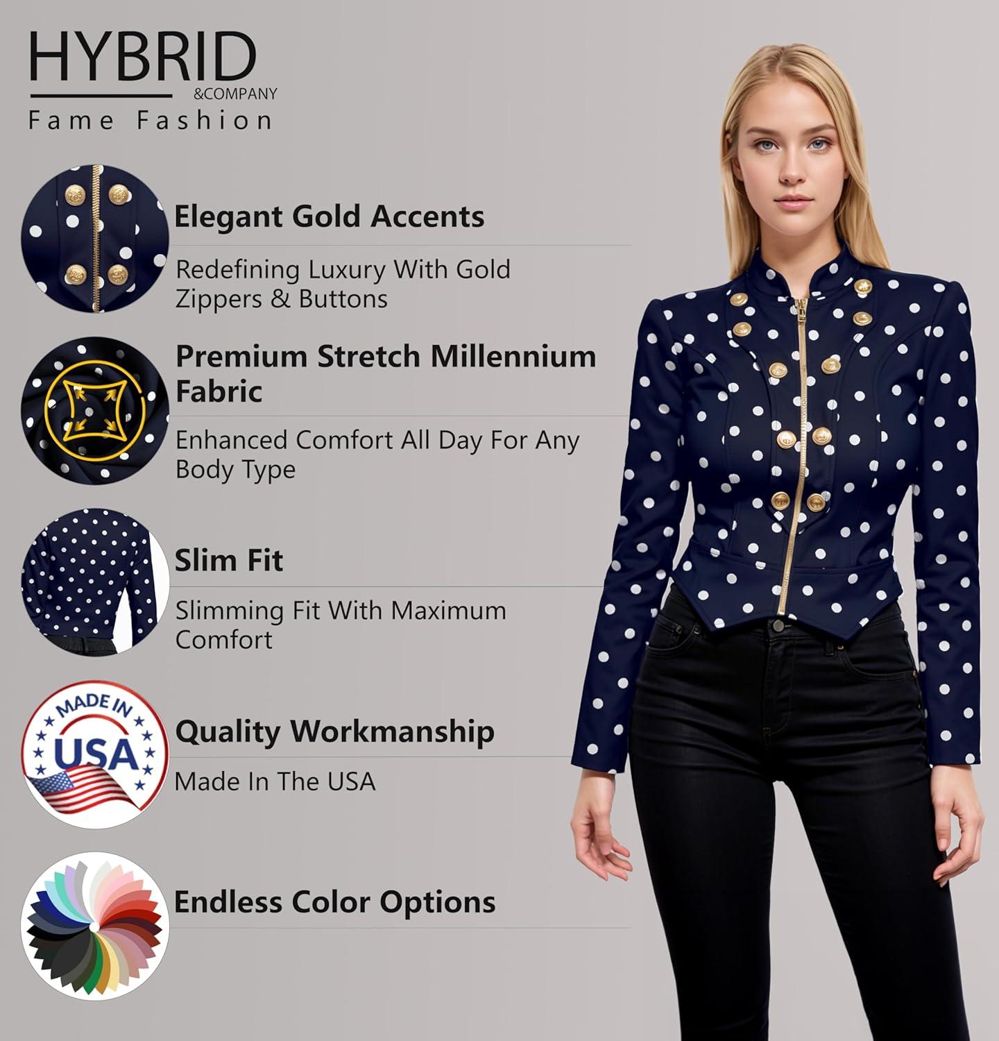 Hybrid & Company Women’s Fashion Military Crop Premium Ultra Stretch Gold/Sliver Millennium Zipper Up Dressy Blazer Jacket(10575-navwhi)