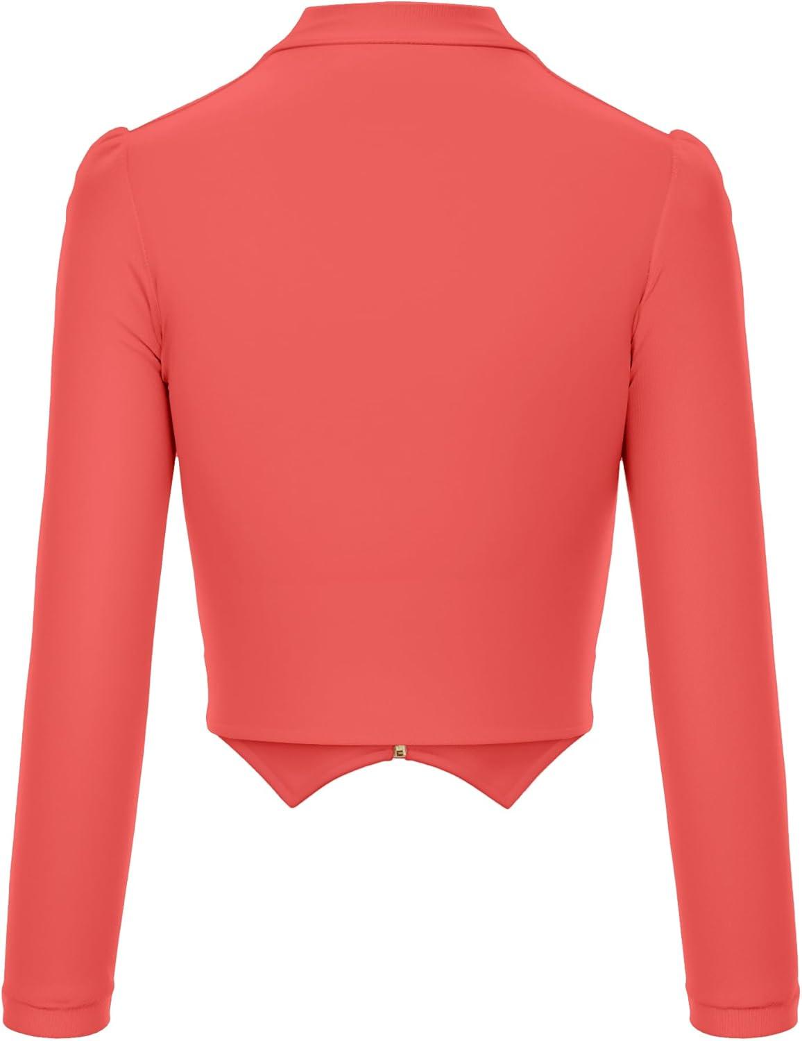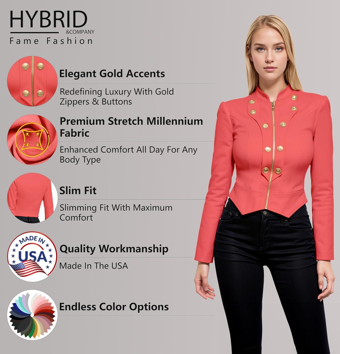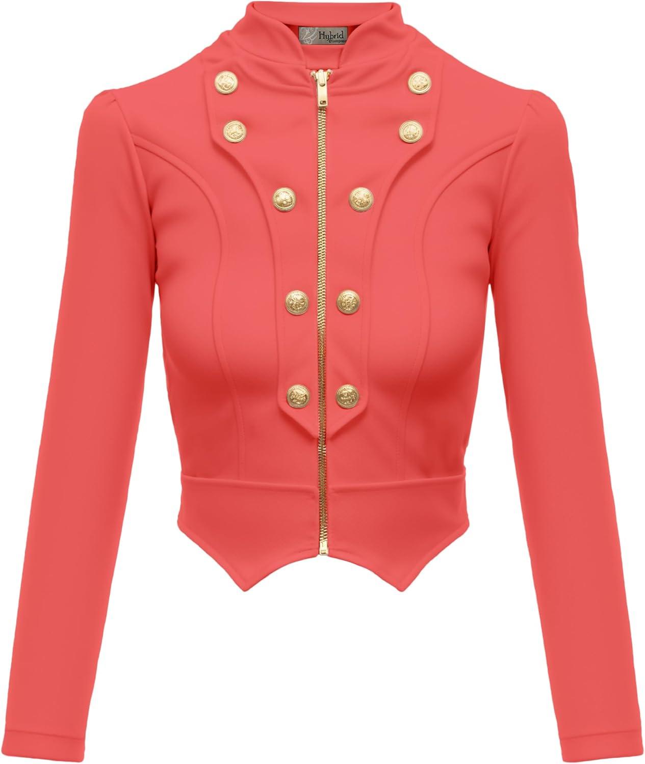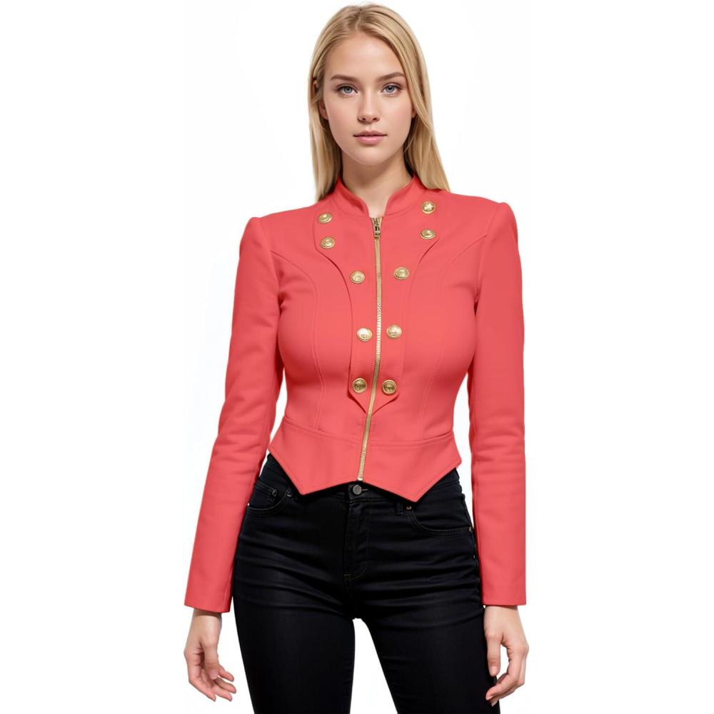 Hybrid & Company Women’s Fashion Military Crop Premium Ultra Stretch Gold/Sliver Millennium Zipper Up Dressy Blazer Jacket(Coral)