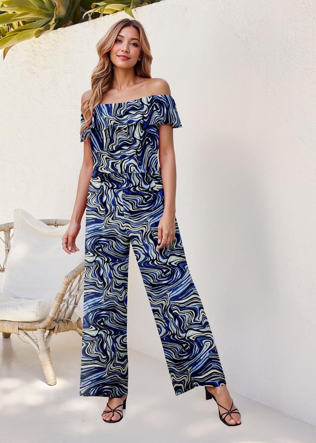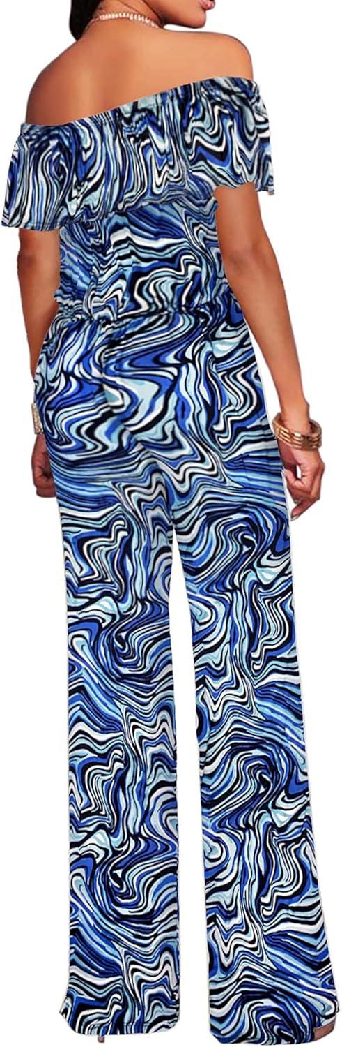 Hybrid & Company Women’s Lightweight Off Shoulder Jumpsuit – Stretchy Wide Leg Romper – Casual to Formal One Piece Outfit(11386-navy Multi)
