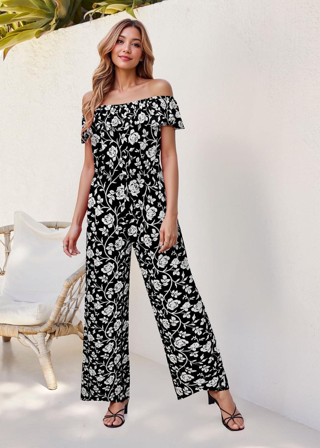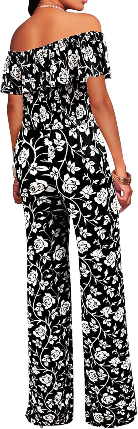 Hybrid & Company Women’s Lightweight Off Shoulder Jumpsuit – Stretchy Wide Leg Romper – Casual to Formal One Piece Outfit(Blackwhite-11525)