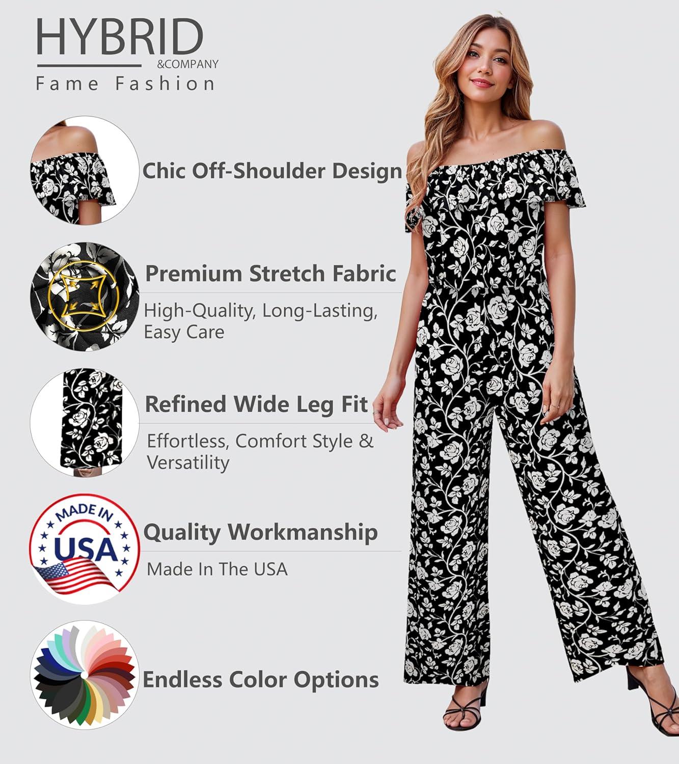 Hybrid & Company Women’s Lightweight Off Shoulder Jumpsuit – Stretchy Wide Leg Romper – Casual to Formal One Piece Outfit(G219836-blackwhite)