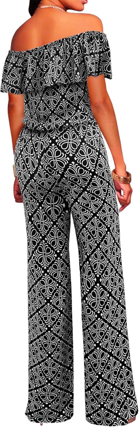 Hybrid & Company Women’s Lightweight Off Shoulder Jumpsuit – Stretchy Wide Leg Romper – Casual to Formal One Piece Outfit(Blackwhite-11526)