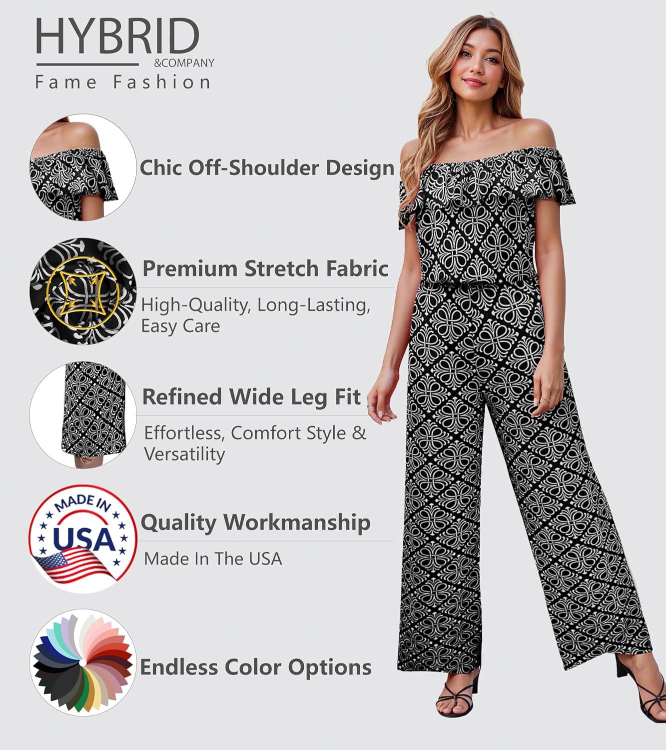 Hybrid & Company Women’s Lightweight Off Shoulder Jumpsuit – Stretchy Wide Leg Romper – Casual to Formal One Piece Outfit(G219836-blackwhite)