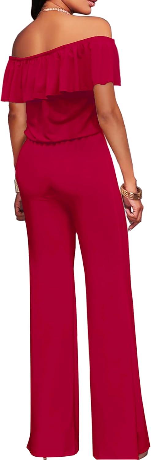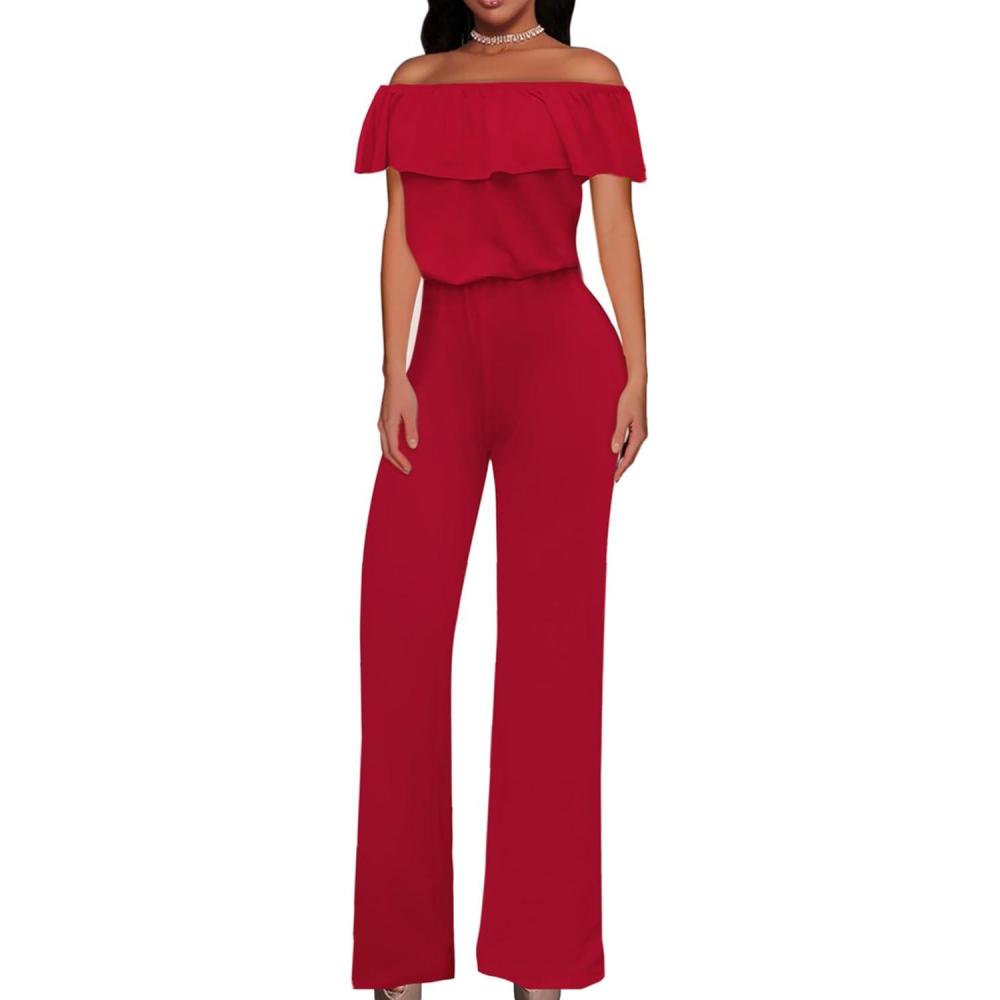 Hybrid & Company Women’s Lightweight Off Shoulder Jumpsuit – Stretchy Wide Leg Romper – Casual to Formal One Piece Outfit(Red)