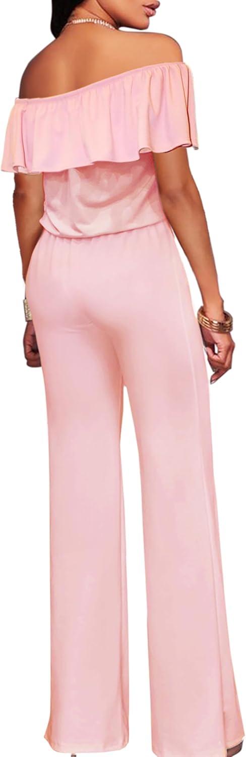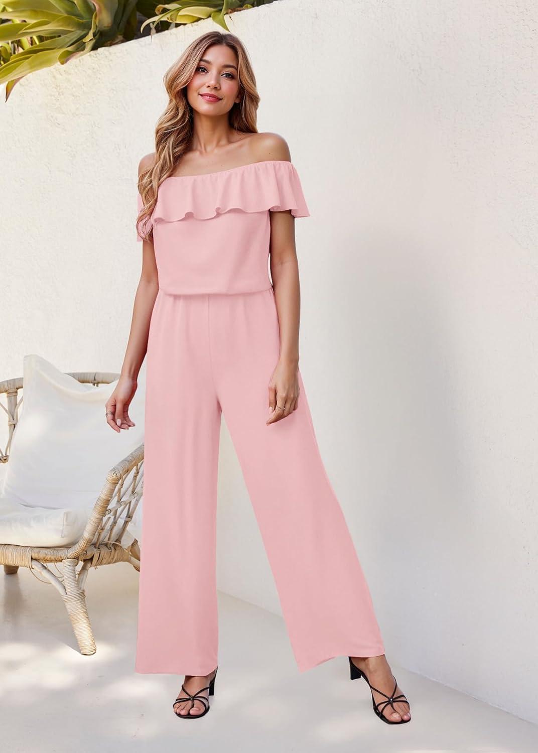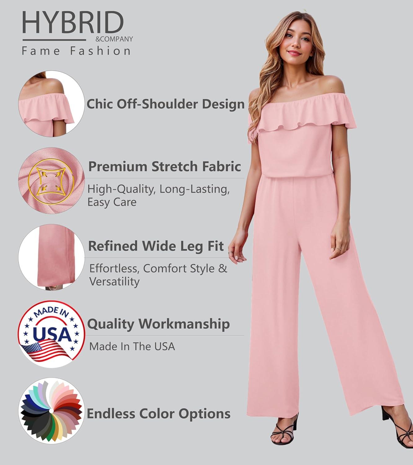 Hybrid & Company Women’s Lightweight Off Shoulder Jumpsuit – Stretchy Wide Leg Romper – Casual to Formal One Piece Outfit(Textured-BLUSH)