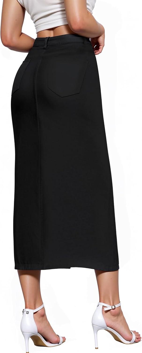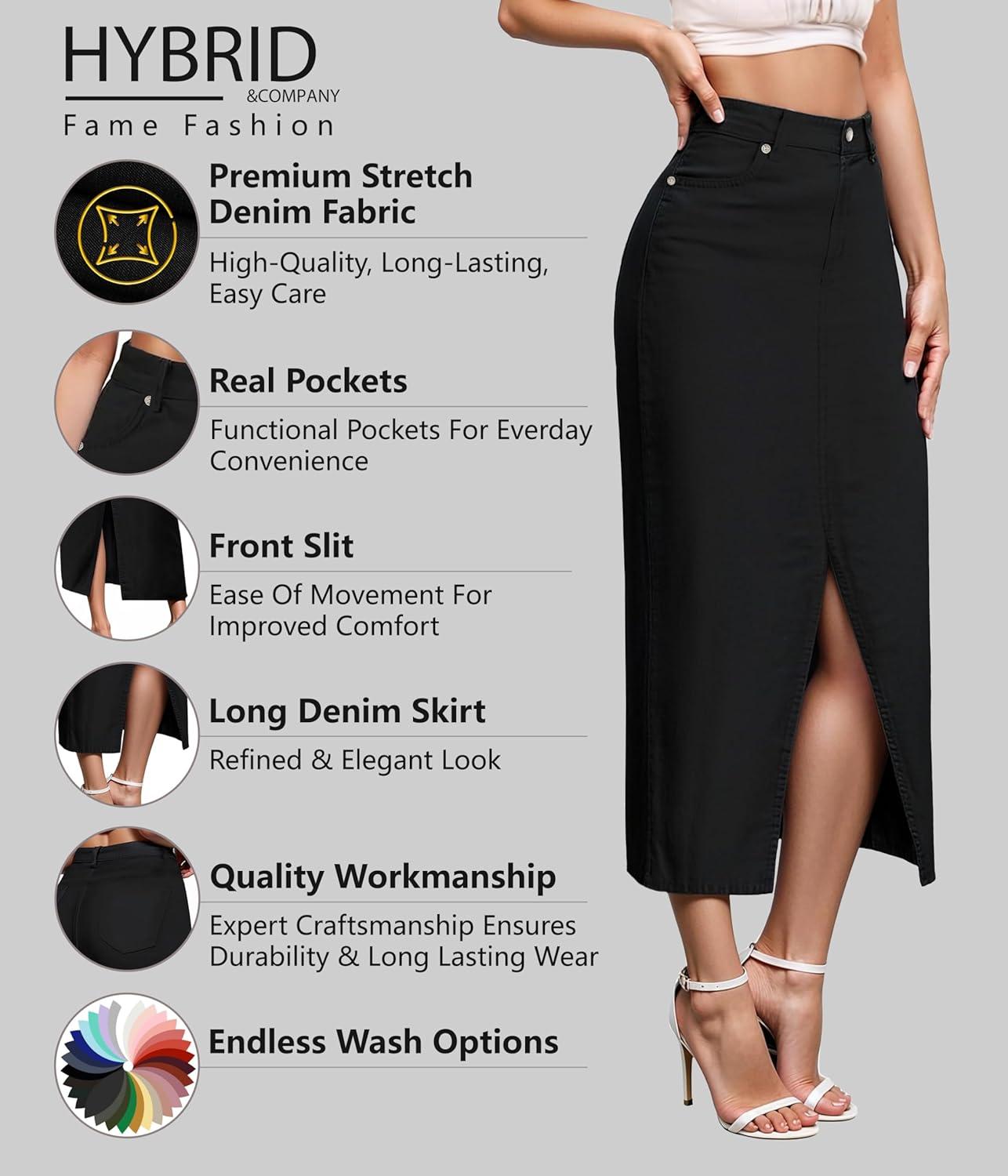 Hybrid & Company Women’s Long Denim Skirt – Stretch Jean Skirt for Office and Casual Wear(Jet Black)