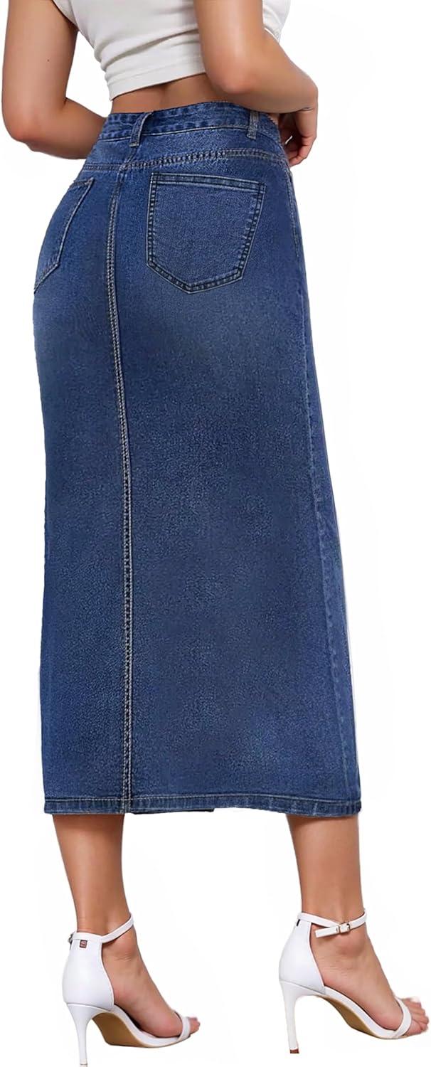 Hybrid & Company Women’s Long Denim Skirt – Stretch Jean Skirt for Office and Casual Wear(Medium Blue)