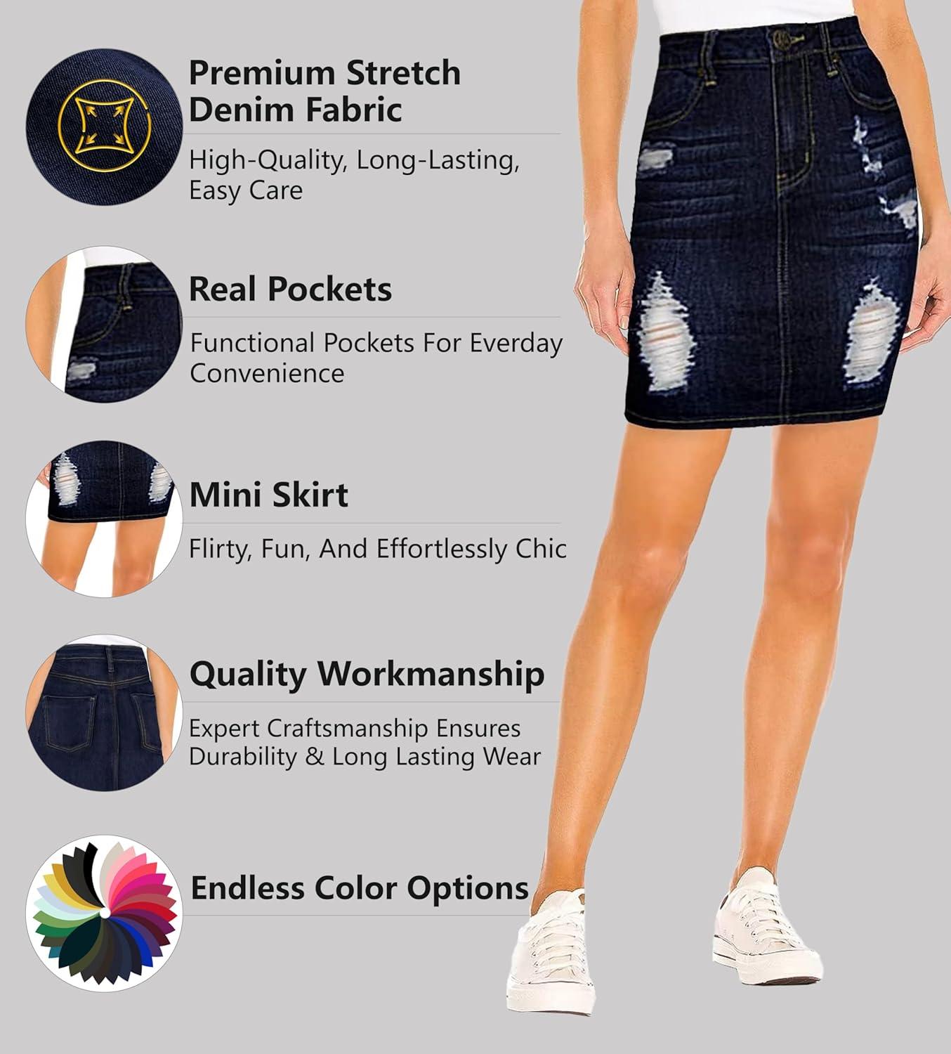 Lexi Womens Stretch Pencil Skirts with Functional Pockets, A Line & Destructed Mini Denim Skirts(Indigo a)